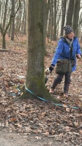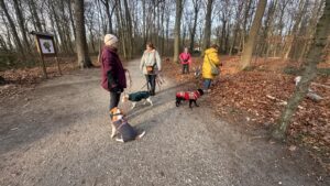 Dann ging es auf den Rundweg durch das weitläufige Gebiet. So eine fröhlich-bunte Beagle-Gruppe weckt natürlich Aufmerksamkeit: neugierige Blicke, freundliche Fragen, und das eine oder andere „Ach, sind die süß!“ begleiteten uns. Unterwegs wechselten sich dann kurze Einheiten aus dem Trailen, dem Dummytraining als auch dem Alltagstraining ab.